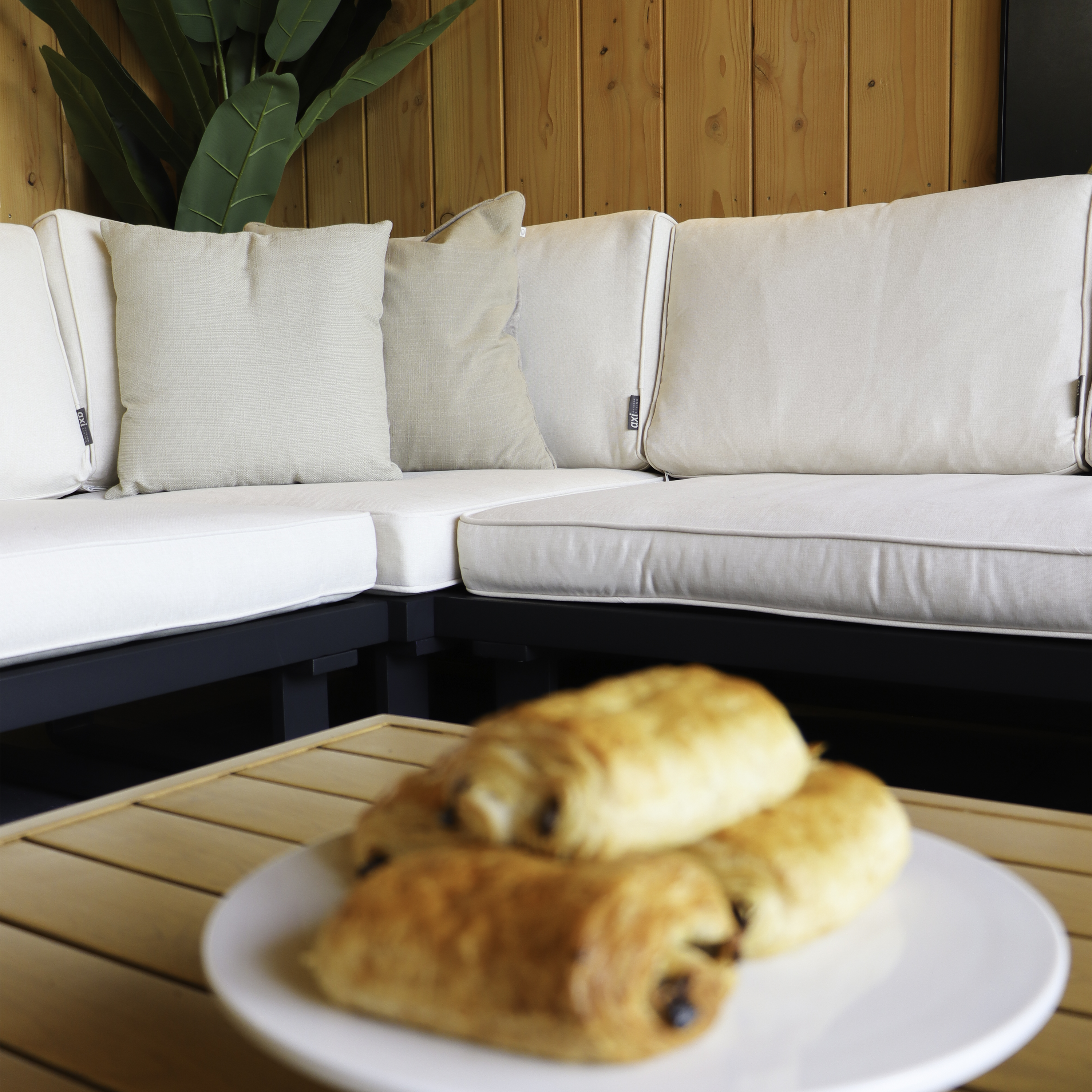 AXI Elin Lounge Set har en varm design. Användningen av rostfritt aluminium gör att ramen inte bara är stark utan också lätt, vilket gör den enkel att flytta runt. Den släta ytan förhindrar att smuts dras till och förenklar underhållet, medan pulverlackeringen säkerställer UV- och väderbeständighet. Elin har 10 cm tjocka Olefin-dynor för både sits och rygg för extra komfort och rymmer 7 personer. Olefin är vattenavvisande, färgbeständigt och UV-beständigt. Så setet behåller sin elegans i flera år.
