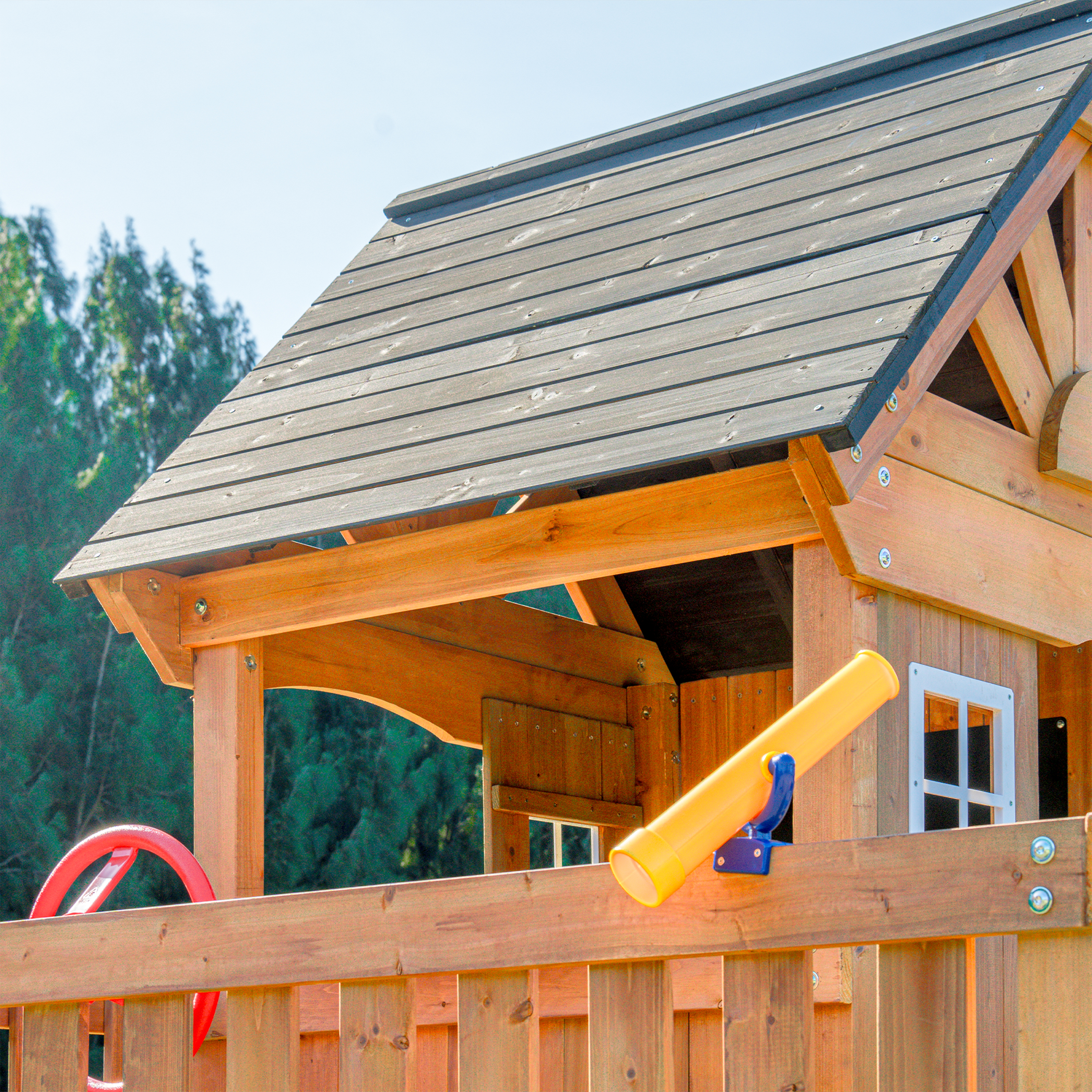 Det finns två sätt att klättra upp till klubbhuset, beroende på ditt barns ålder och klättringsnivå. Nybörjare kan ta det lugnt på stegen och avancerade klättrare kan klättra över klätterväggen. Väl uppe på toppen kan de hålla ett vakande öga på allt genom teleskopet, vrida på styret eller leka en lek med smörost och ägg. När det är dags att åka ner erbjuder den långa rutschkanan en snabb och enkel nedstigning. Rutschkanan är utrustad med en vattenanslutning. Så att du kan njuta av massor av vattenkul även under varma soliga dagar!