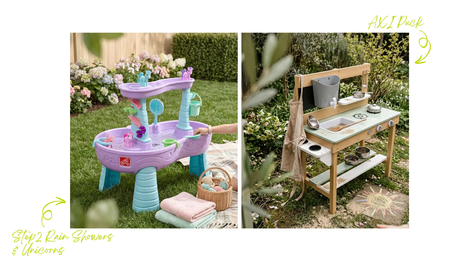 Plastmodeller från märken som Step2 är lätta, färgglada och underhållsfria. De kommer ofta med roliga funktioner som vattenhjul, rutschbanor och fantasiteman som dinosaurier eller enhörningar. Trämodeller från AXI och Sunny är mer naturliga i utseendet och passar fint in i trädgården. De är oftast robusta och hållbara, och många kan senare omvandlas till odlingsbord när barnen blir äldre.