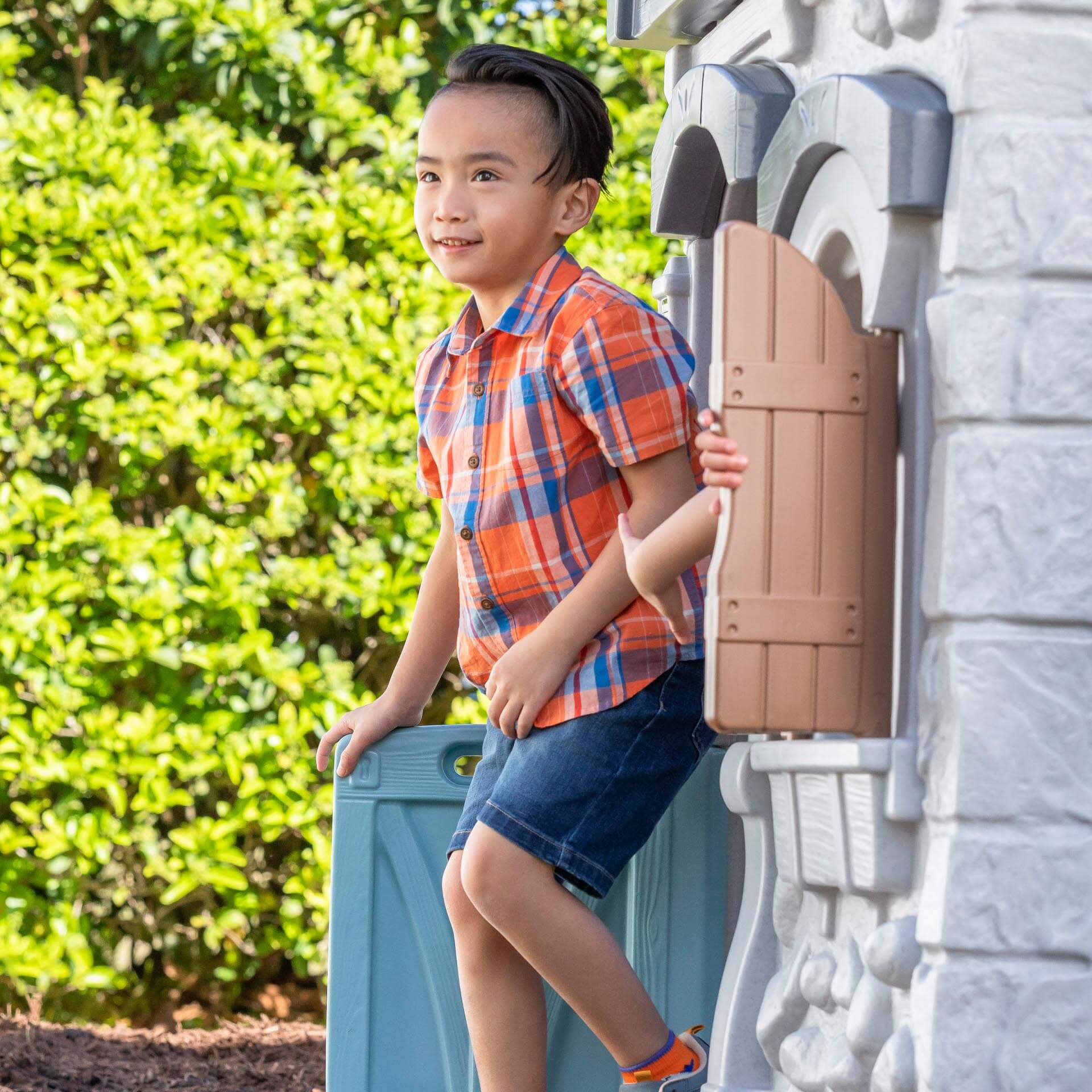 Enchanting Adventures 2-Story Playhouse & Slide'™™ är den perfekta bakgrunden för alla äventyr som din lilla drömmer om. Deras nästa förtrollande äventyr väntar med två våningar för engagerande socialt spel, massor av berättande och låtsaslek med vänner! Från inomhusköket till den övre plattformen, rutschbanan och mer - det finns något roligt för alla att göra och så många låtsaslekmöjligheter i detta charmiga lekhus för barn. Det finns en riktig fungerande dörrklocka som låter vännerna veta att det är dags att leka och en inbjudande dörr i holländsk stil som öppnar in till inomhusköket med låtsasugn, diskbänk med kran och spishäll för att börja laga mat! Klättra upp för den inbyggda stegen för att fortsätta det roliga utomhus på den övre plattformen, komplett med en snabb flyktmöjlighet med den extra långa rutschkanan! Riktigt fungerande fönsterluckor tillsammans med det falska träverket och stenaccenterna ger en charmig sagoboksstuga till detta utomhuslekhus för småbarn.